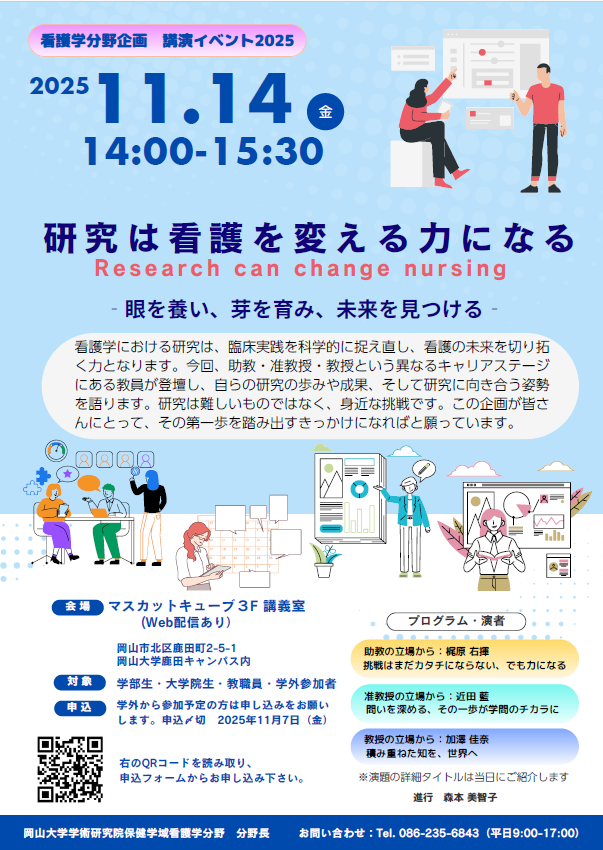 2025年11月14日(金)、岡山大学鹿田キャンパス・マスカットキューブおよびオンライン配信にて、看護学分野企画「講演イベント2025」を開催しました。本イベントでは、学内外へ広く参加を呼びかけ、助教・准教授・教授という異なるキャリアステージの教員3名が、それぞれの研究の歩みと実践を語り、「研究は看護をよりよく変える力である」というメッセージを発信しました。
