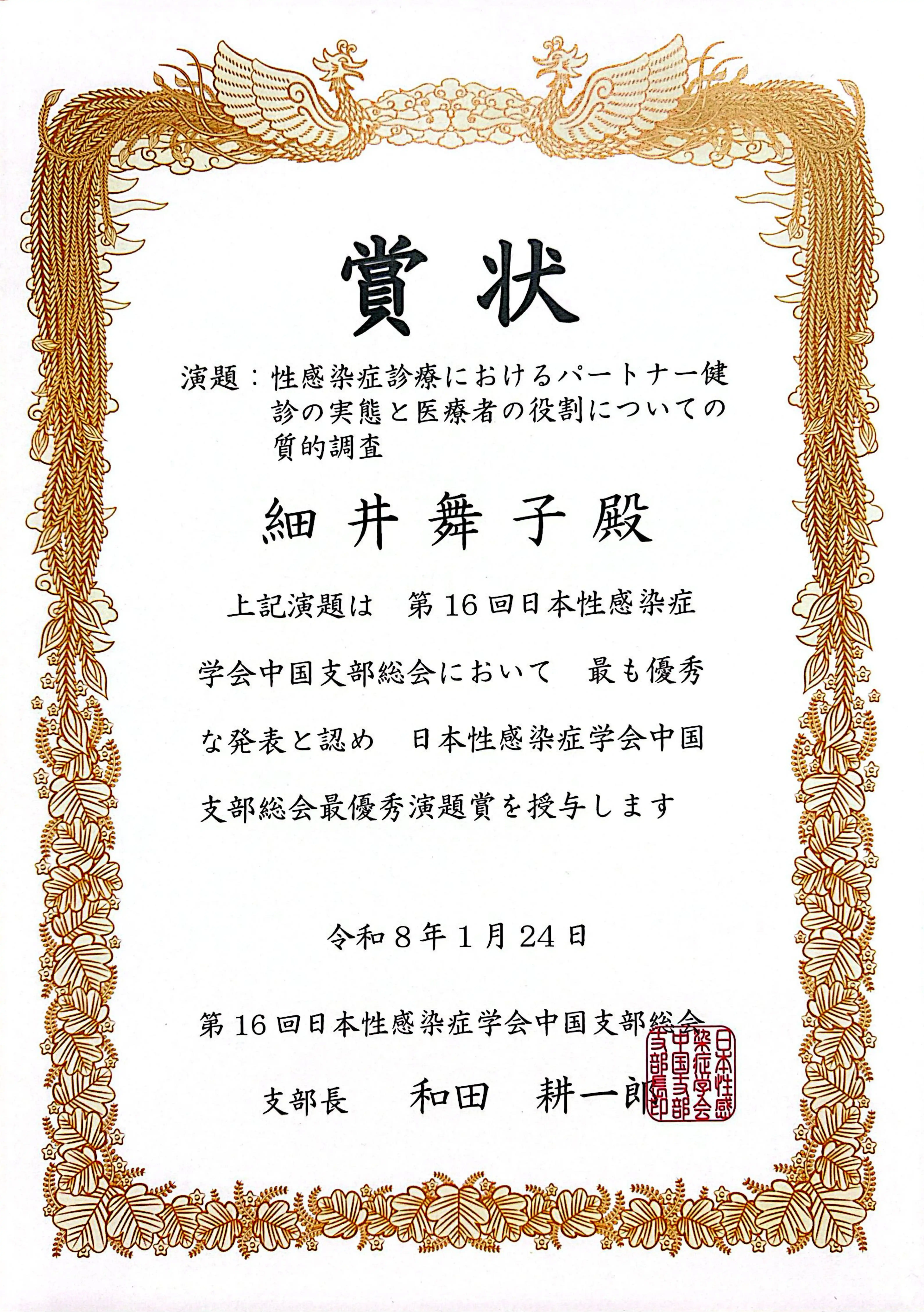 2026年1月に開催された第16回日本性感染症学会中国支部総会において、演題“性感染症診療におけるパートナー健診の実態と医療者の役割についての質的調査”を発表し、最優秀演題賞をいただきました。患者がパートナーへ自らの感染を知らせ適切に検査や医療につなげることは①性感染症患者自身の再感染を防ぐ②パートナーが性感染症罹患を認知し必要時治療を行う③パートナーを発端としたさらなる感染拡大を防ぐといった意義がありますが、我が国の性感染症診療におけるパートナー健診の実態は明らかになっていませんでした。そこで私は、パートナー健診は重要な性感染症対策のひとつになりうると考え、自治体の公衆衛生担当医師/保健師を含む研究チームを立ち上げ、性感染症診療を担う医師、看護師/助産師の皆様に直接お話を伺うことでパートナー健診の実態と課題を明らかにしました。本研究にご協力いただきました医師、看護師/助産師の皆様に心より感謝申し上げます。